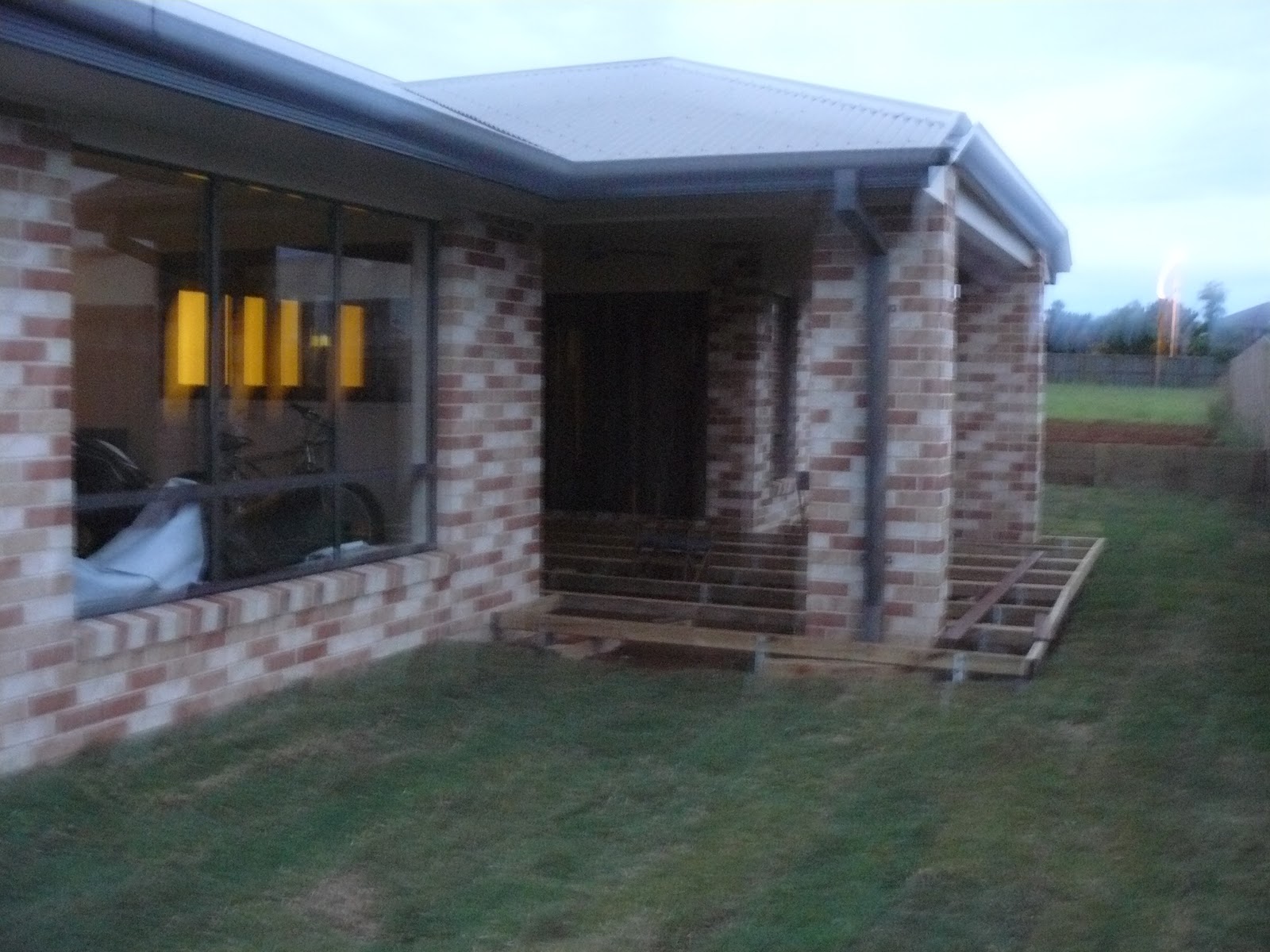At the beginning of last week, we had just started the front deck by digging the holes for it. Be the end of the week it was completed. What do you think? I built this one myself, (with the helping hand of my Father). We had to dig all the holes and then get the frame right. Once the frame was done, It took around two and a half days to get all the timber cut to length and screwed on.